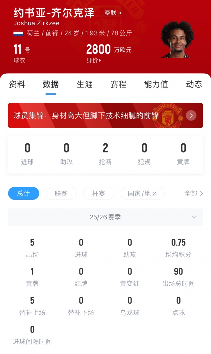 皆尔克泽前年夏窗以4250万欧转会费加盟曼联,本赛季0球0助,当今德回身价2800万欧。