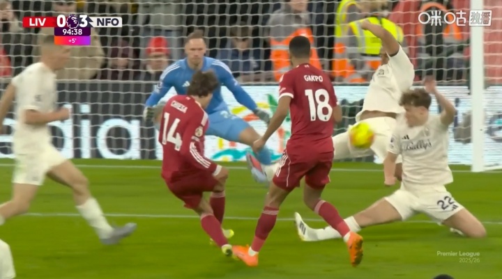 11月23日讯 在利物浦0-3不敌诺丁汉丛林的补时终末时间,基耶萨近距离抽射,被本场的进球元勋穆里略用裆部挡出。