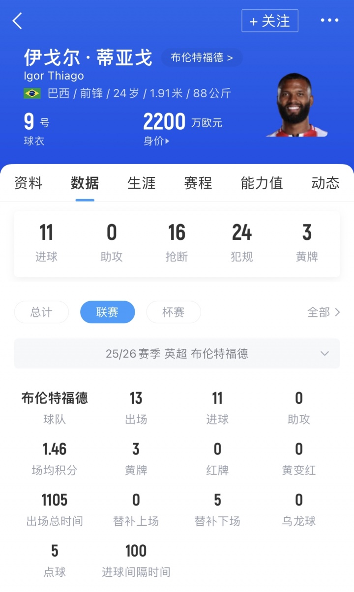 梦念念取得巴西征召!伊戈尔·蒂亚戈英超13场11球 身高1米91大中锋