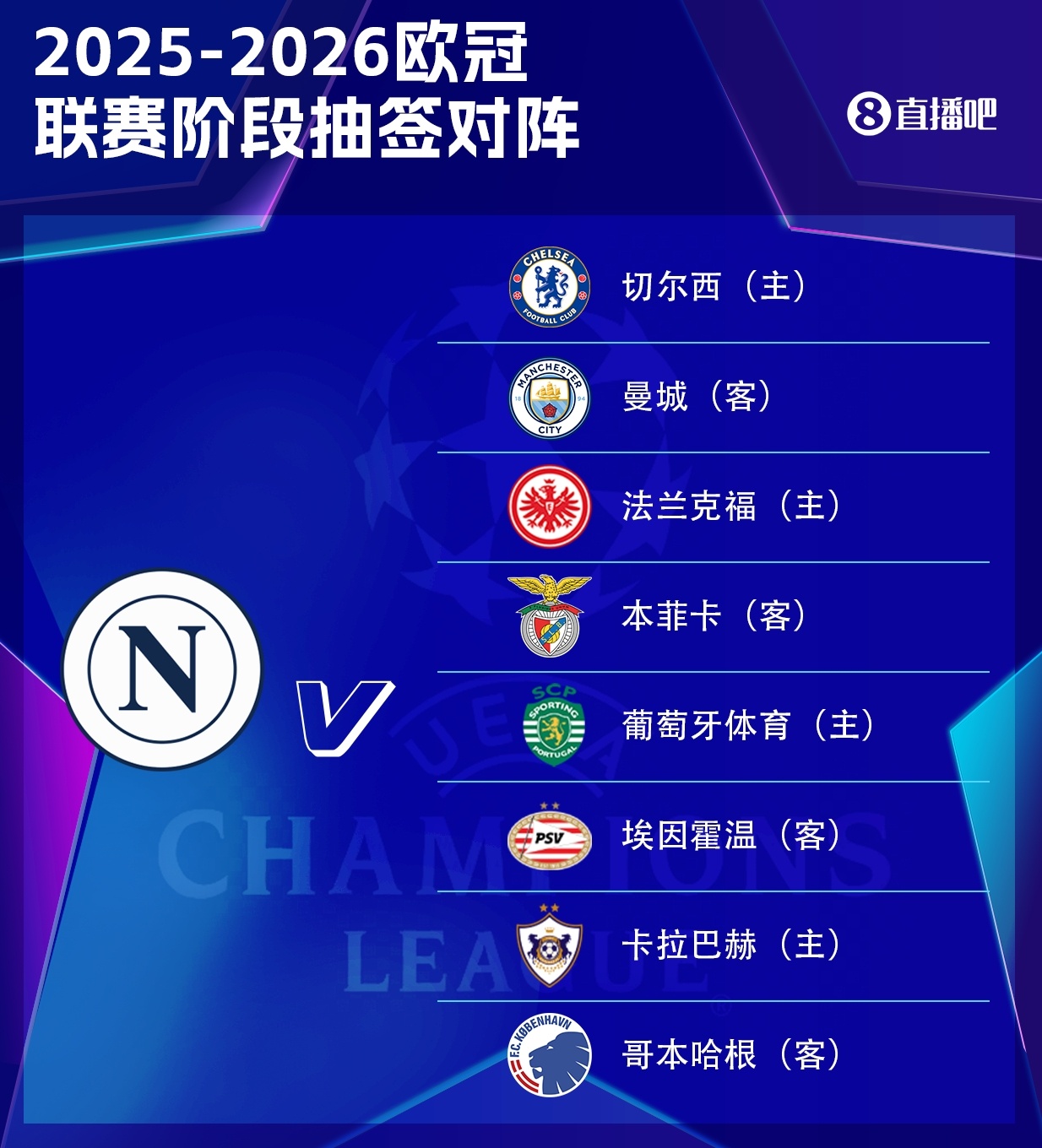 8月29日讯 25-26赛季欧冠联赛阶段抽签,那不勒斯联赛阶段8支敌手出炉。