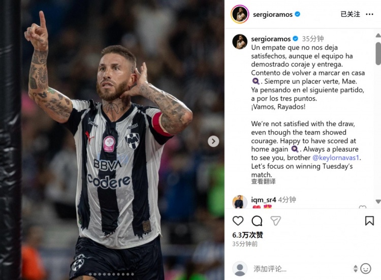 攻破老队友把守球门,拉莫斯社媒:见到我的兄弟纳瓦斯老是很欢娱