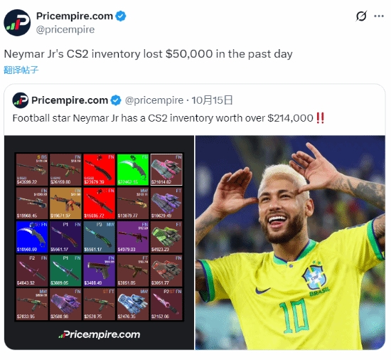 嗜好CS2的巴西球星内马尔也未能避免,据PriceEmpire透露,内马尔正本朝上20万好意思元的个东谈主《CS2》饰品库存,仅在畴昔24小时内就缩水约5万好意思元。