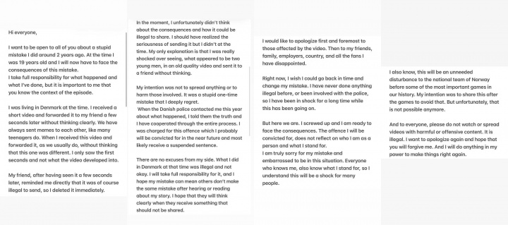 我也深知,这将在挪威国度队迎来史上最热切赛事之际,酿成无须要的骚动。我本研究在赛事轨则后公布此事以幸免影响,可惜已无法完竣。