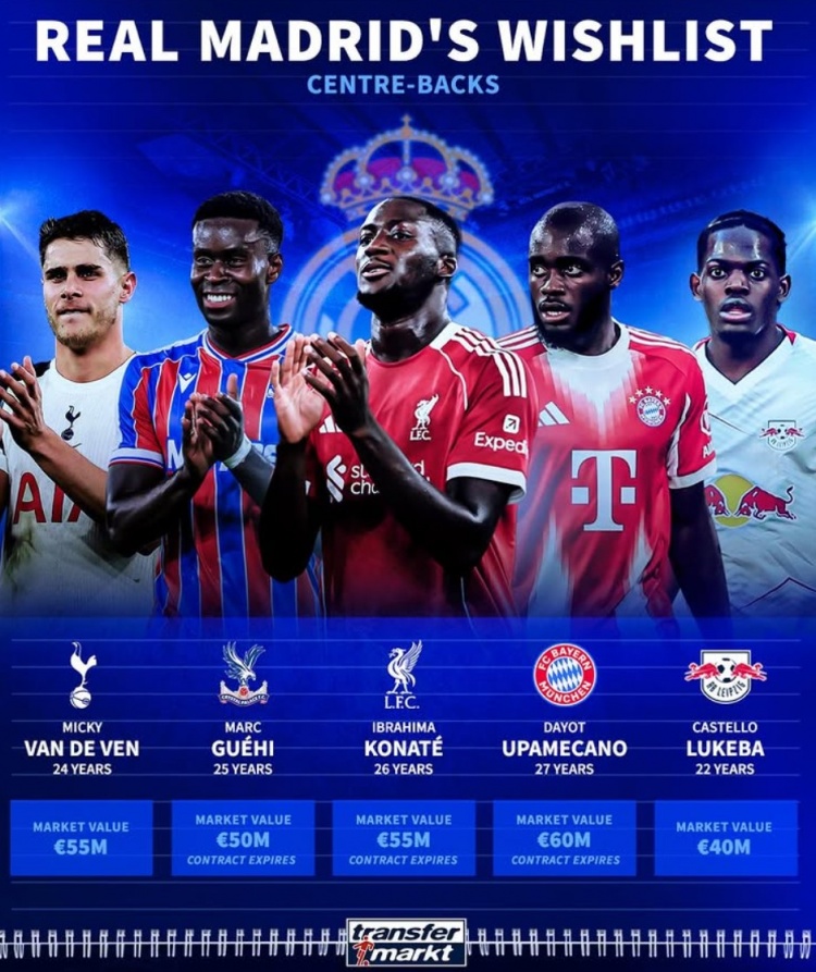 11月9日讯 皇马但愿在来岁补强中卫位置,《转会市集》也列出了皇马的5大候选盘算: