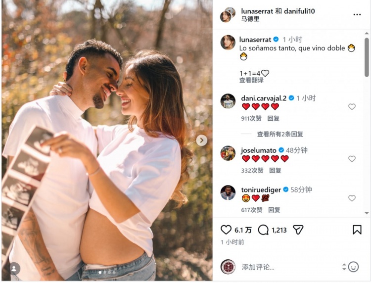 塞巴略斯、卢娜社媒晒出合照,卢娜配文:“我们梦寐以求了这么久,结果迎来双倍惊喜,1+1=4。”