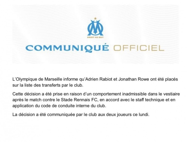 赛后爆发热烈冲破,马赛官方:已将拉比奥特与洛维列入出售名单
