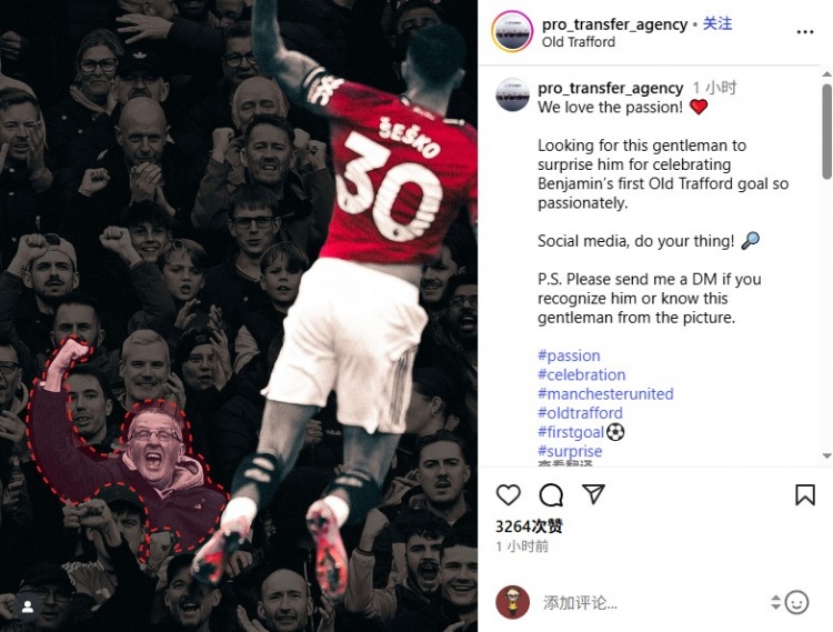 舍什科的经纪公司Pro Transfer Agency晒出这位球迷的相片,并写说念:“咱们爱这份神气!正在寻找这位先生,念念给他个惊喜,因为他为舍什科的老特拉福德首球进行了如斯存眷的庆祝。”