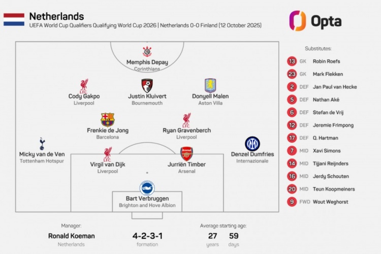 10月13日讯 世初赛欧洲区小组赛,荷兰在主场迎战芬兰。本场比赛,荷兰再次排出了莫得任何又名荷甲球员的首发威望,这是橙衣军团本年第5次作念出如斯安排。此前,荷兰国度队统统年份莫得排出荷甲球员的首发威望也仅有5次费力。