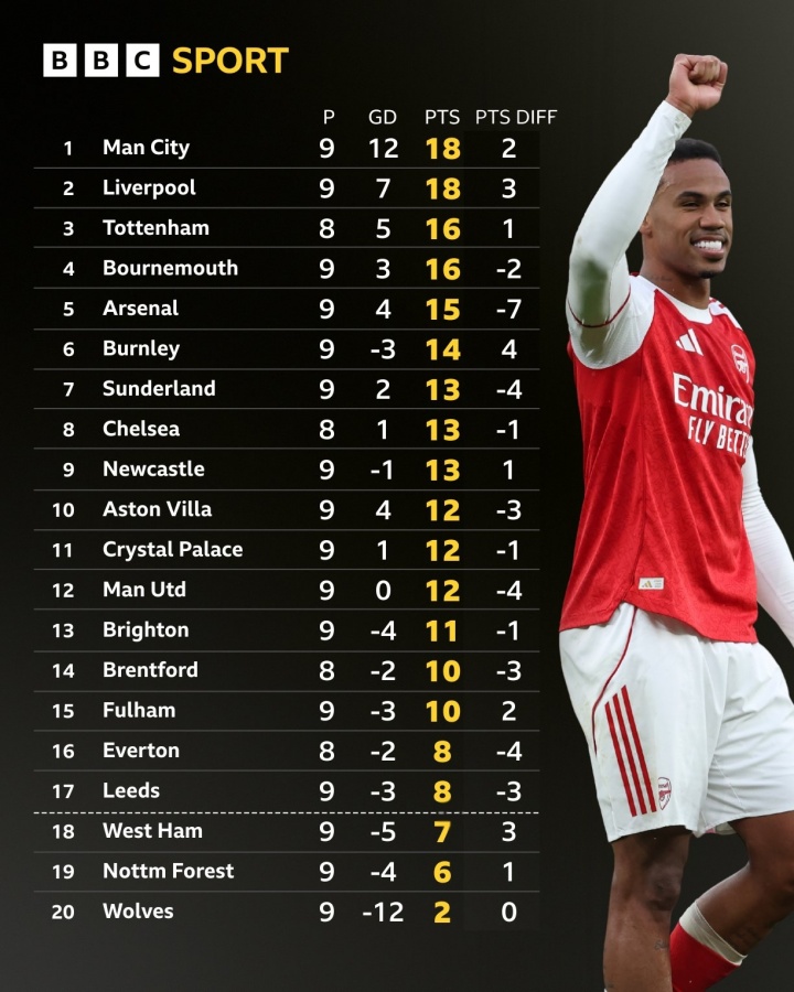 BBC统计仅计较暴露战进球英超积分榜:阿森纳-7分掉第5,曼联第12