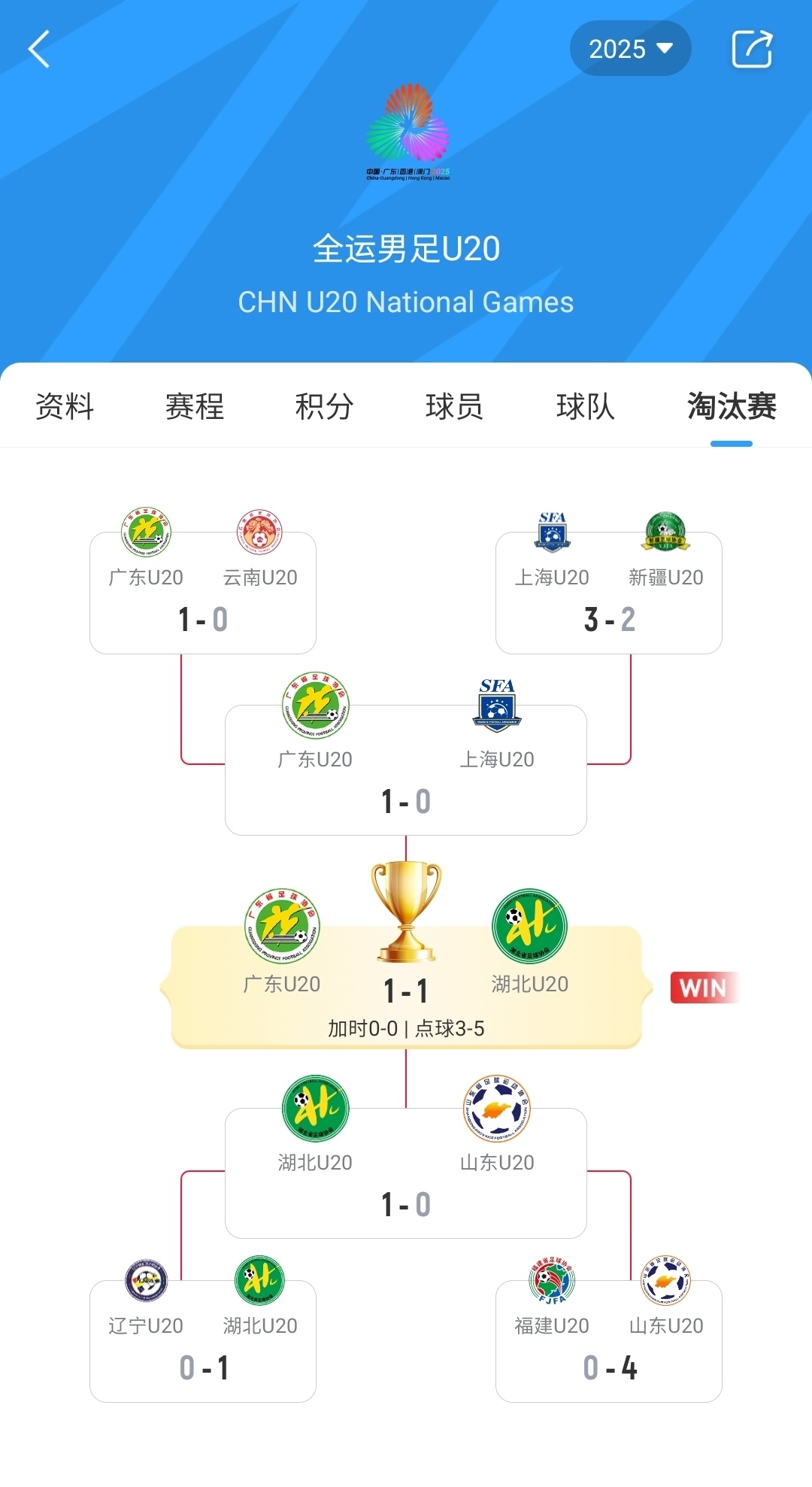 全运会男足U20最终名次:湖北首夺金 广东银牌 上海铜牌 山东第4