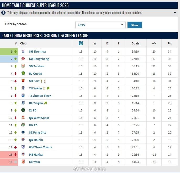 中超酷好积分榜:主场比赛积分榜&客场比赛积分榜