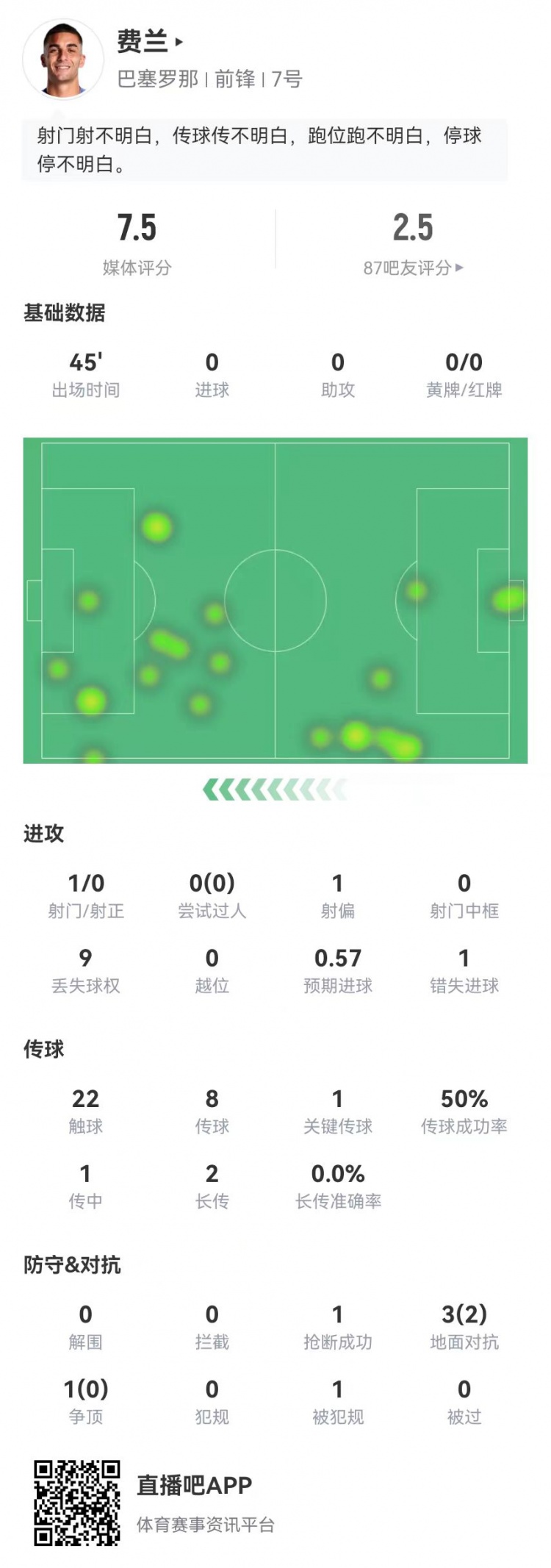 招供吗?费兰本场1射1失良机1环节传球 4挣扎2告捷 7.5分全队最高