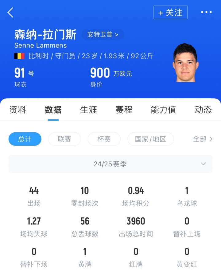 拉门斯时年23岁,比利时籍门将。上赛季他为比甲安特卫普出战44场,获取10场零封,场均失球1.27个。当今其德回身价为900万。