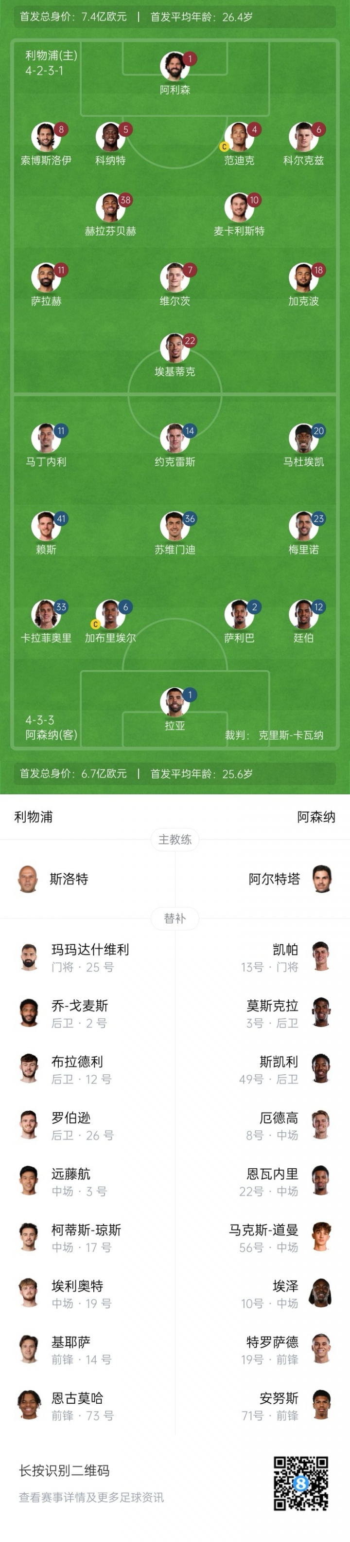 利物浦首发:1-阿利森、4-范迪克、5-科纳特、6-科尔克兹、8-索博斯洛伊、10-麦卡利斯特、38-赫拉芬贝赫、18-加克波、7-维尔茨、11-萨拉赫、22-埃基蒂克