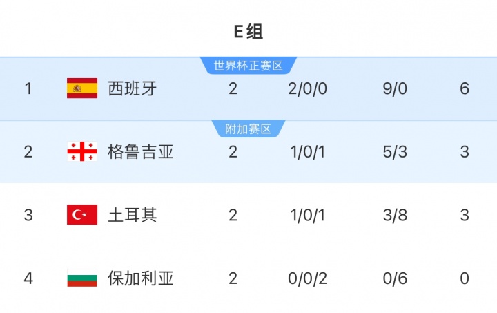西班牙国度队将于10月中旬辞世初赛中对阵格鲁吉亚和保加利亚,当今西班牙积6分位列E组第一,跨越格鲁吉亚3分。