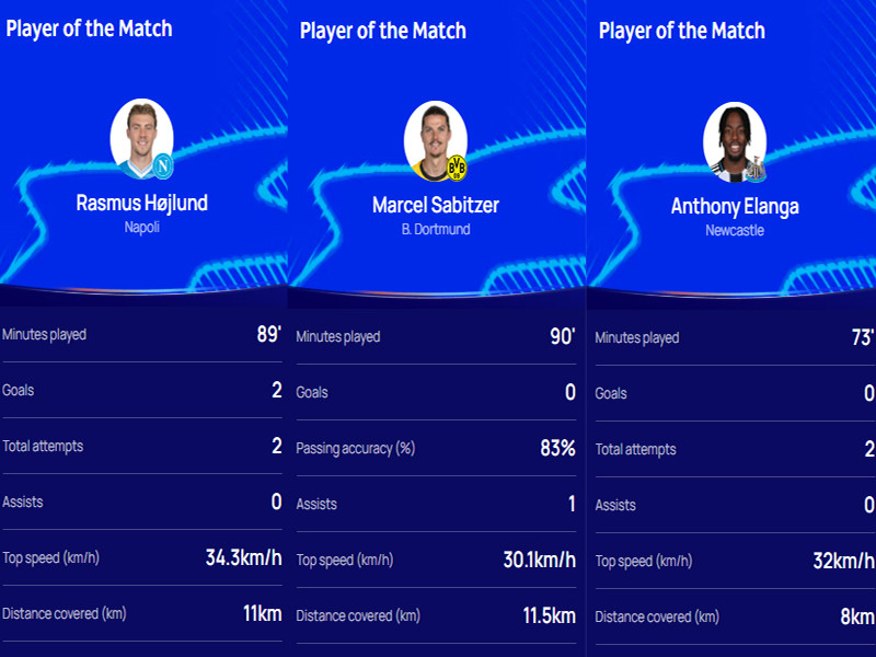 先望望全场最好,证据欧足联官网发布的信息,来自那不勒斯的霍伊伦,多特蒙德的萨比策,还有纽卡斯尔的埃兰加,三名曼联旧将,赛后都被评比为全场最好。同期,三支球队均迎来欧冠的首场凯旋,首轮补时连丢两球,失去2分的多特蒙德,也曾高潮到积分榜的前八名。