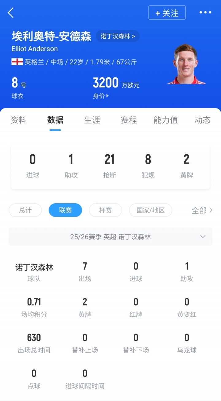 现年22岁的安德森于2024年以3500万镑从纽卡转会至诺丁汉丛林,如今已成长为英超最注认识新星之一。