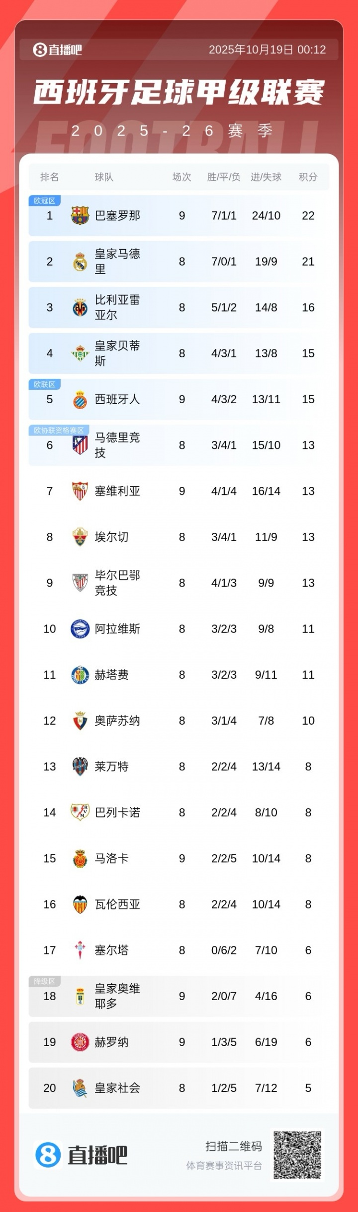 西甲积分榜:巴萨先赛暂升榜领袖先皇马1分,皇马明日客战赫塔费