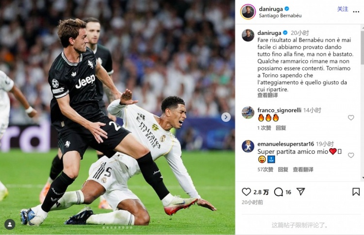 鲁加尼此役为尤文踢满全场,他在外交媒体上晒出比赛像片,配文:“在伯纳乌球场赢得好服从从来皆扼制易,咱们拼尽全力来回到临了一刻,但依然不够。”