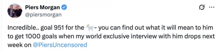 著名主握东谈主皮尔斯-摩根在社媒发文颂赞C罗:太不成想议了……(山羊图案,GOAT)打进了第951个进球!