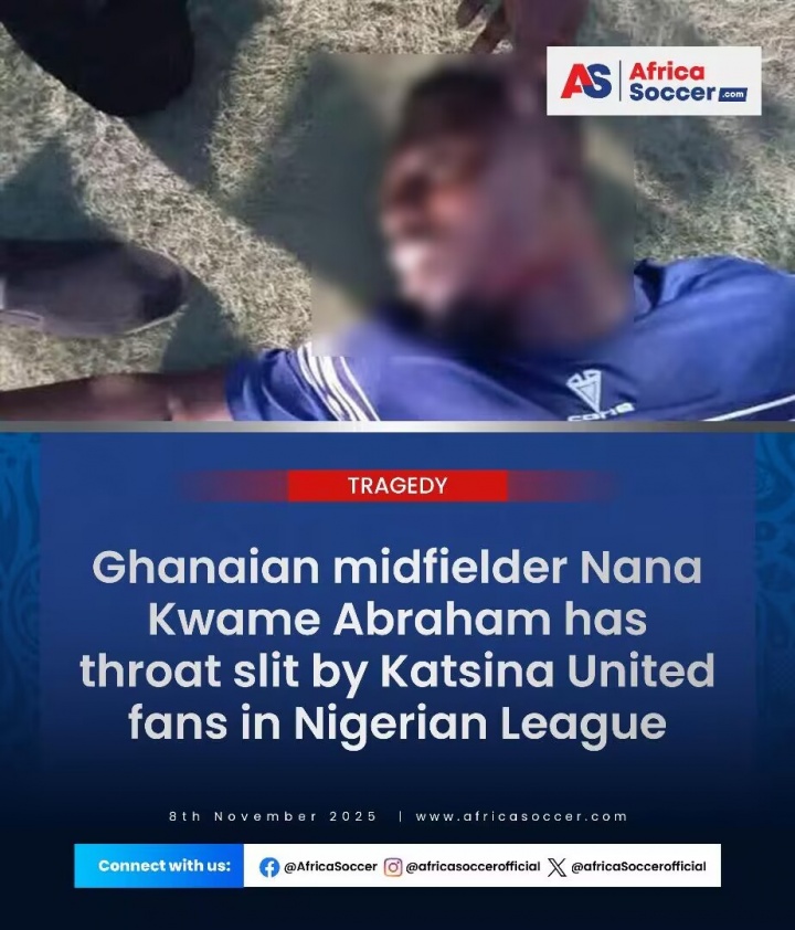 11月09日讯 据外媒Africa soccer报谈,在尼日利亚超等足球联赛周六卡王人纳联队与巴拉乌的比赛中发生了一谈耸东谈主听闻的事件,加纳中场球员纳纳·夸梅·亚伯拉罕在参与打入扳平比分的进球后遭到主队球迷的割喉。