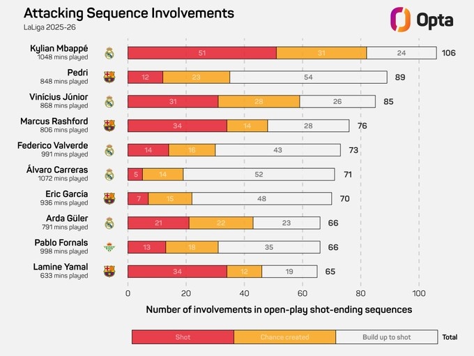 本赛季西甲参与灵验迫切排行:姆巴佩106次居首,佩德里89循序二