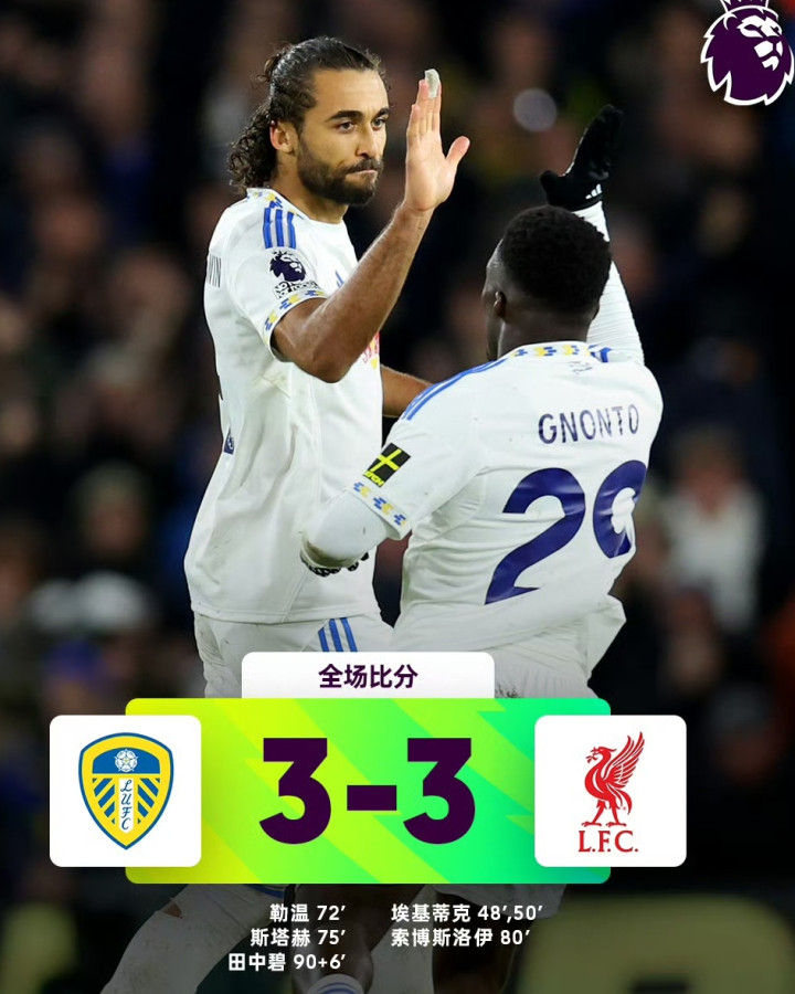 即使如斯,利物浦这齐没能守住,补时第96分钟角球失守,没能抢点突围,日本球员田中碧把执契机绝平,一场3比3的平局。