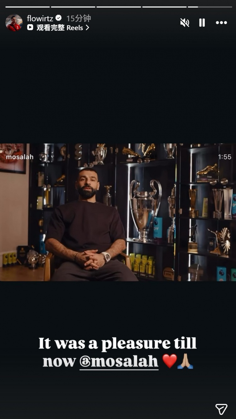 维尔茨社媒转发萨拉赫的动态,配文:“直到现在,与你共事都很愉快,萨拉赫。”