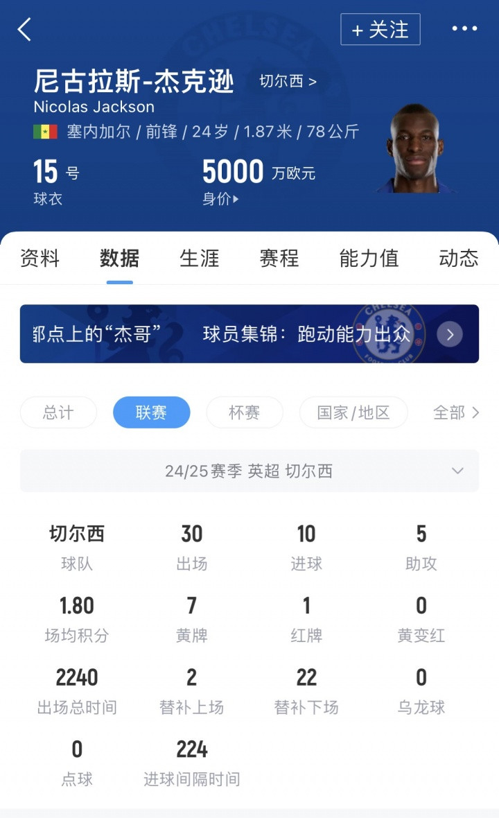 杰克逊现年24岁,当今德回身价5000万欧,切尔西2023年破耗3700万欧从比利亚雷亚尔将其引进。上赛季杰克逊为切尔西出战38场得益16球5助。