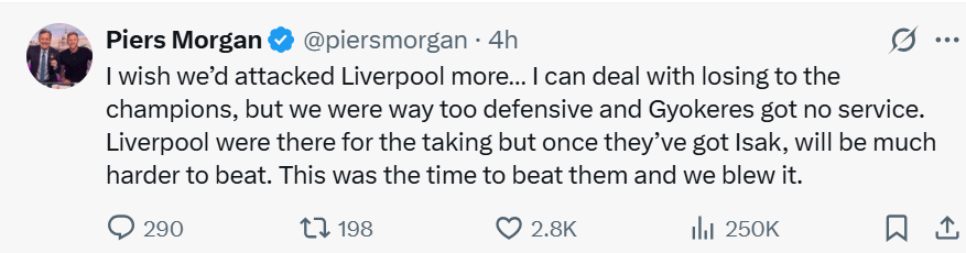 虎扑09月01日讯在此前物化的一场英超比赛中,阿森纳0-1不敌利物浦。本场比赛物化之后,驰名主合手东说念主、驰名枪迷皮尔斯-摩根更新了酬酢媒体,发文谈到了他对这场比赛的倡导。