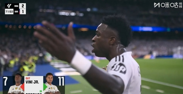 10月27日讯 西甲第10轮西班牙国度德比,皇马主场迎战巴萨,第72分钟,维尼修斯被换下,所有这个词喋喋赓续,下场直接回更衣室。皇马换上罗德里戈。