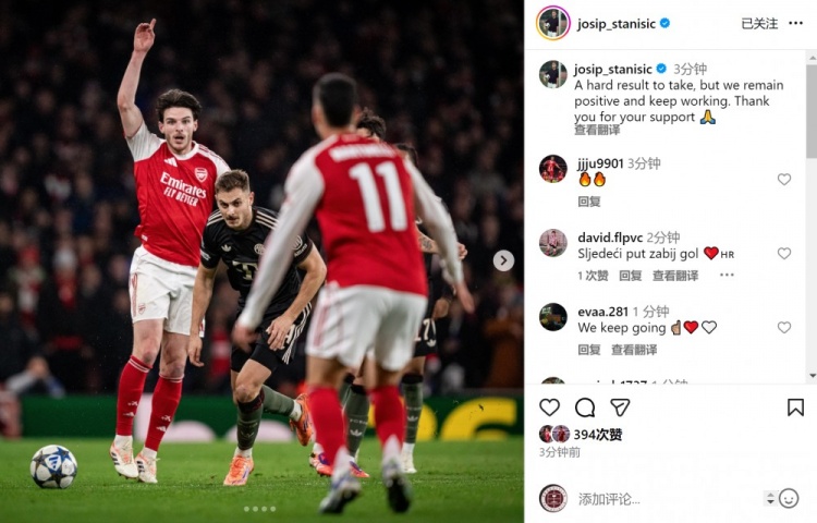 斯坦尼西奇社媒晒出比赛像片,配文:“这是一个难以罗致的恶果,但咱们仍是保合手积极的魄力,延续尽力。感谢人人的扶直。”