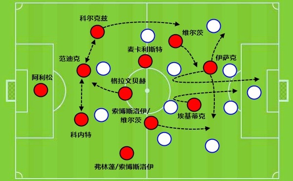 利物浦的后场会更多摆出一个三中卫,科尔克兹是一个准中卫,当他前插助攻时,后腰格拉文贝赫会变酿成中卫。
