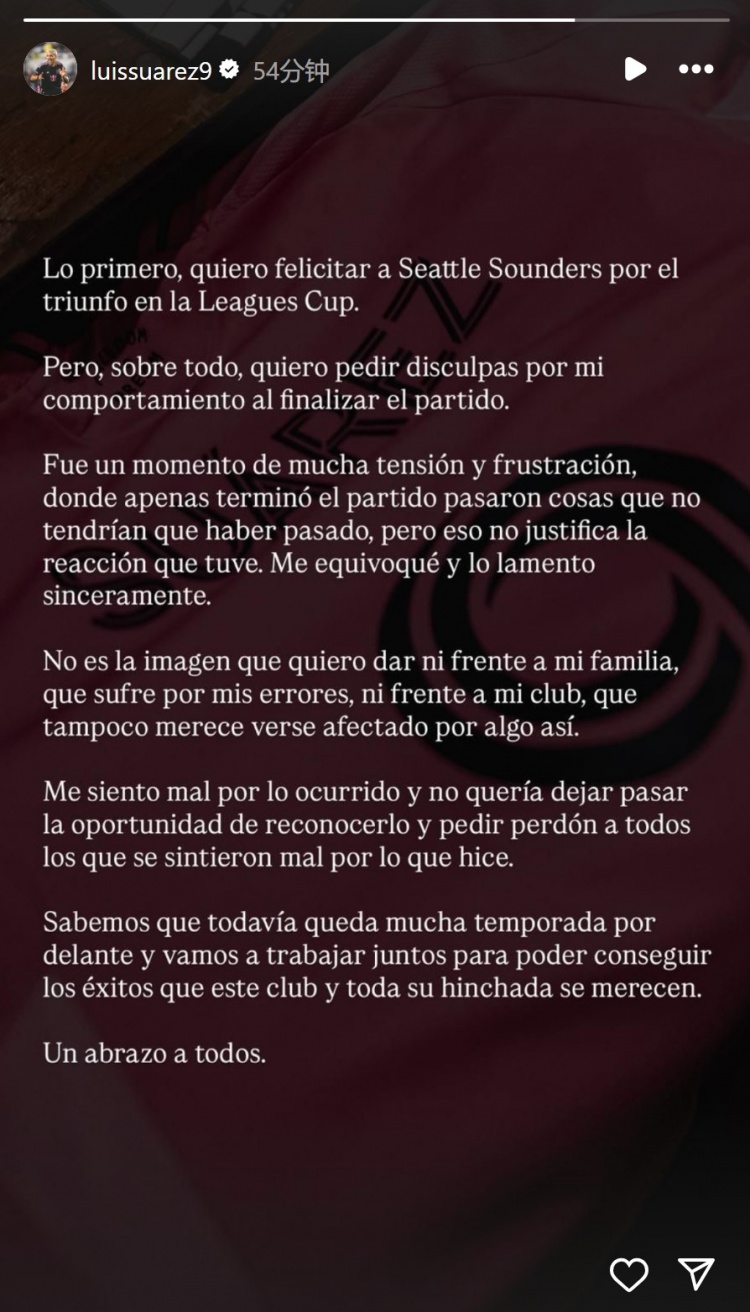 苏亚雷斯写谈:“最初我要道贺西雅图海湾东谈主队赢得定约杯冠军。但最遑急的是,我要为我方比赛截止时的活动谈歉。